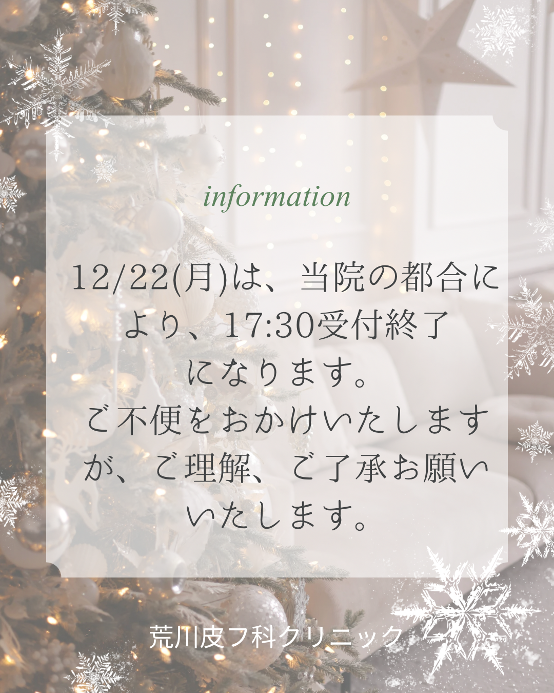 🌟12/22日,診察終了時間変更のお知らせ🌟2025.12.15 患者様へお知らせです📝 令和7年12/22日㈪は、都合により17時半受付終了となります。 ご不便をおかけいたしますが、ご周知、ご理解の程 よろしくお願いいたします🙇