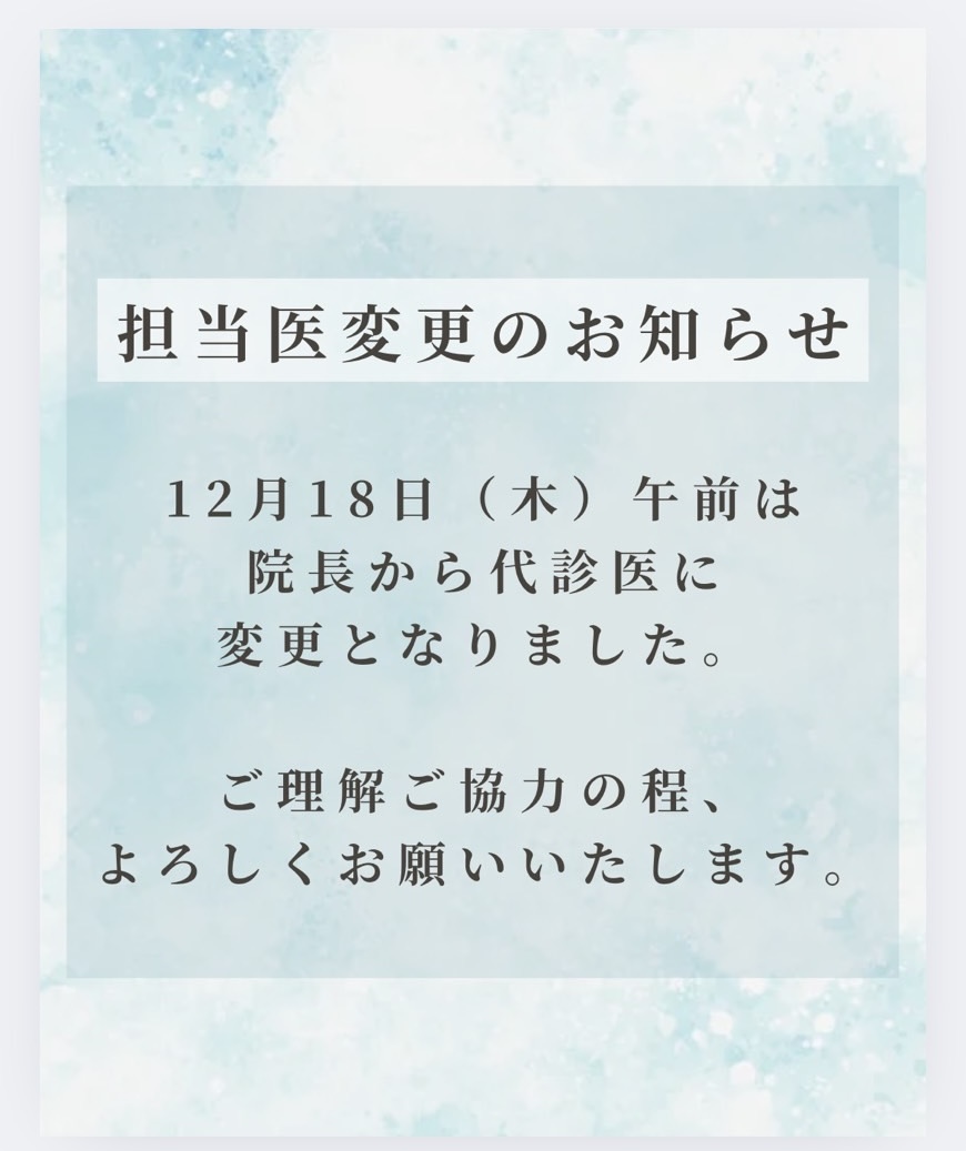 📝12/18(木)午前,担当医変更のお知らせ2025.12.16 患者様へお知らせです。 いつも当院をご利用いただきましてありがとうございます。 12/18日(木)は代診医担当に変更となります。 ご理解、ご了承のほどよろしくお願いいたします。