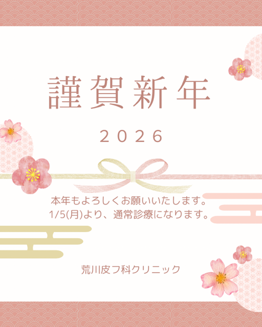 🎍新年のご挨拶とお知らせ🎍2026.01.06 旧年中は大変お世話になりました。 本年もどうぞよろしくお願いいたします。 皆様のご健康とご多幸をお祈り申し上げます。 🌟R8年1/5㈪より、通常診療開始しております。 12月は、院長から代診医の変更がございましたが、 🌟1月より、従来通りの院長先生の診察に戻りました。 皆様のご来院心よりお待ちしております。 荒川皮フ科クリニック 一同