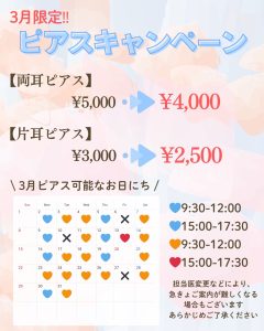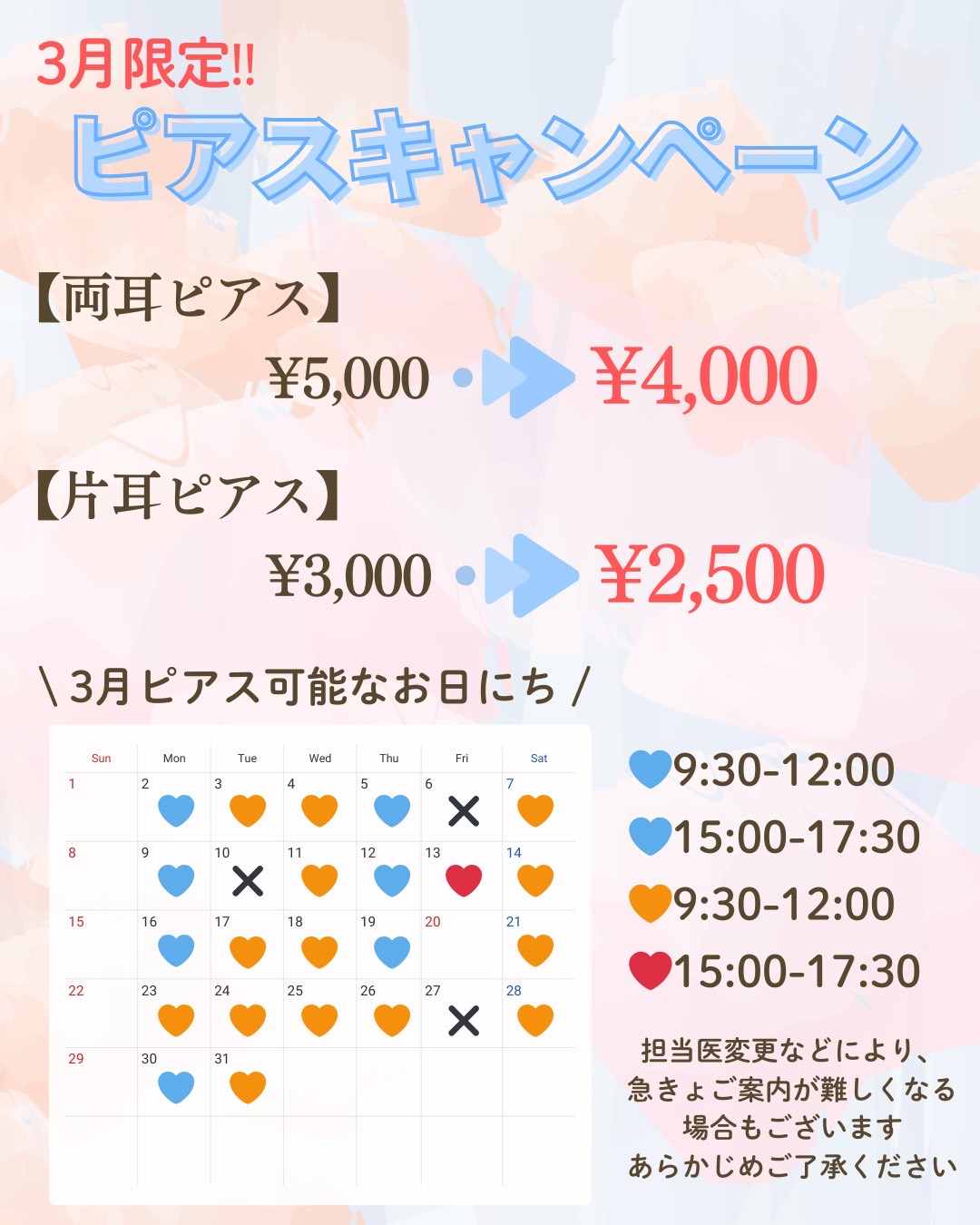 🌸3月限定!ピアスキャンペーンのお知らせ✨